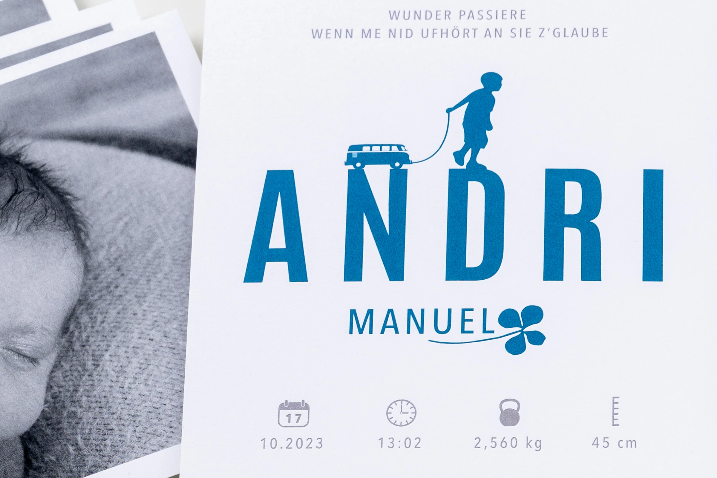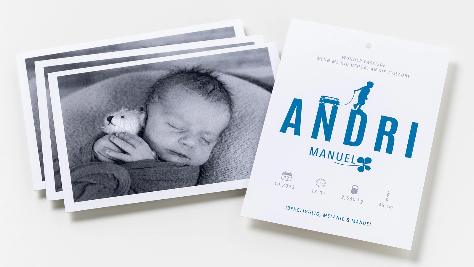 Für die Geburt von Andri Manuel entstand eine fein abgestimmte Geburtskarte, die Emotionalität und gestalterische Präzision verbindet.